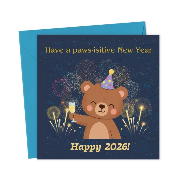 Cute New Year Bear Card 2026 – Funny “Paws-itive” Pun